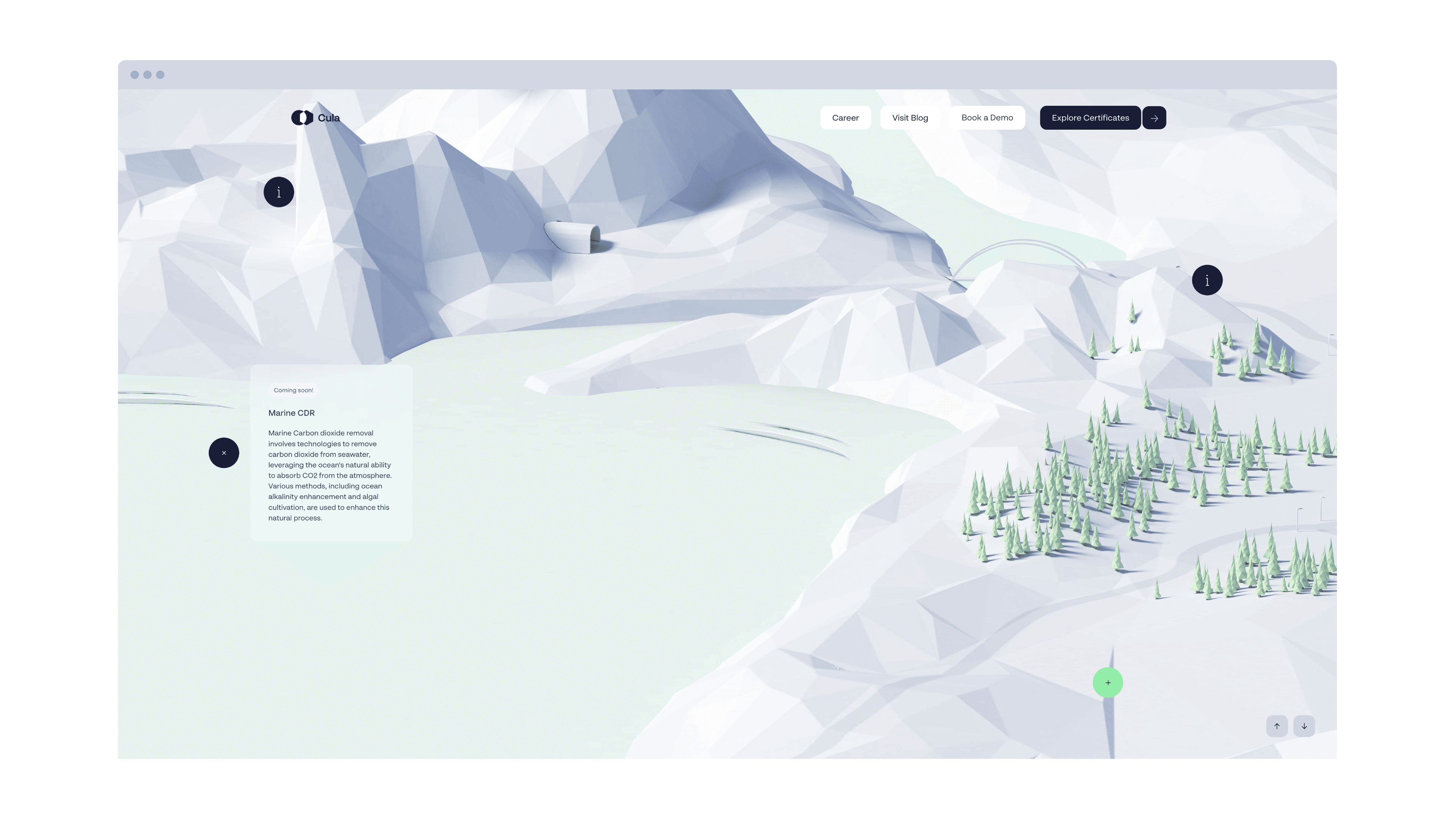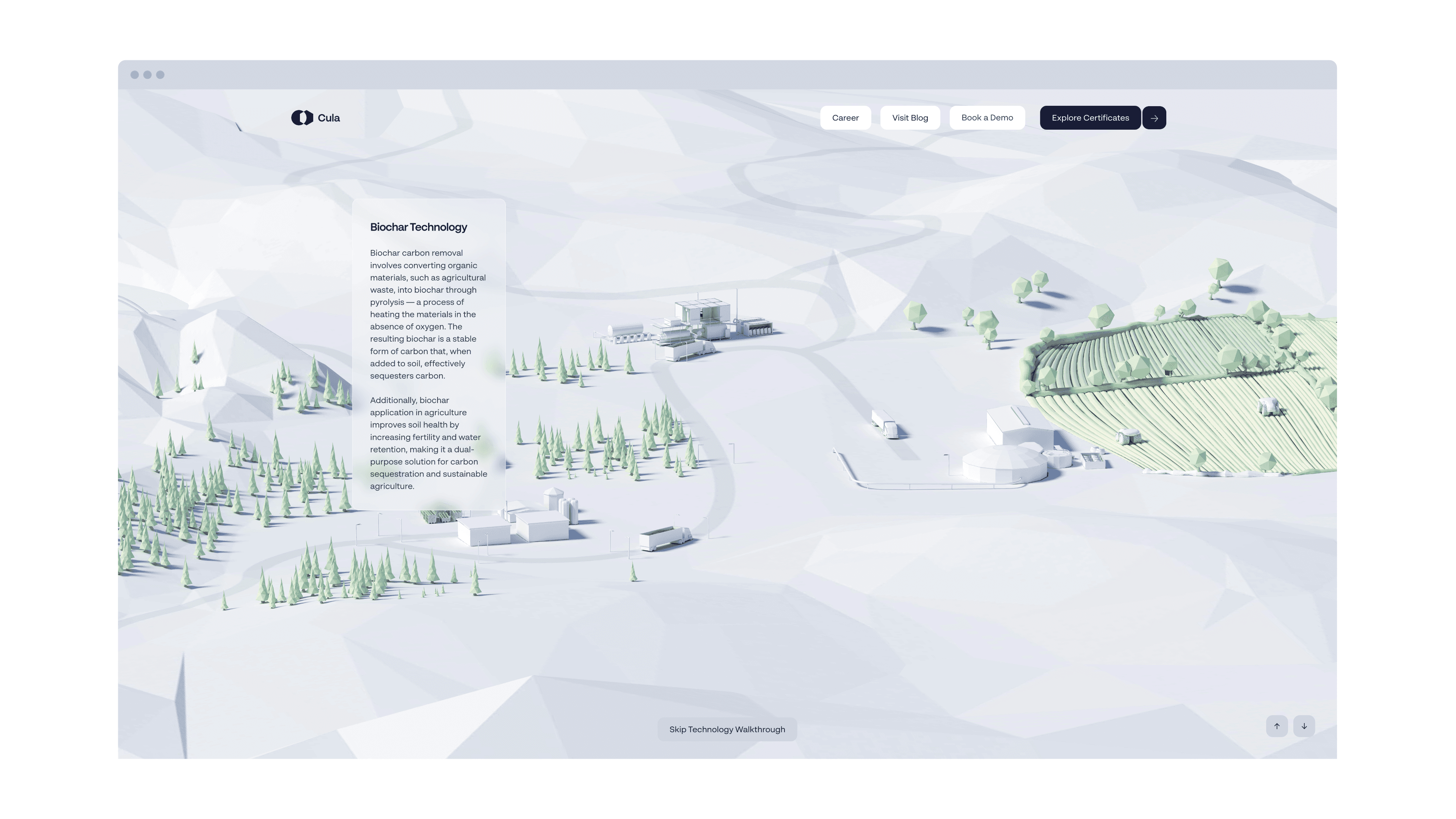 I invested in the pre-seed stage and created their identity in 2023. For the website, we knew we needed something memorable. We partnered with Refokus and created a website featuring a 3D world to explain biochar carbon removal.