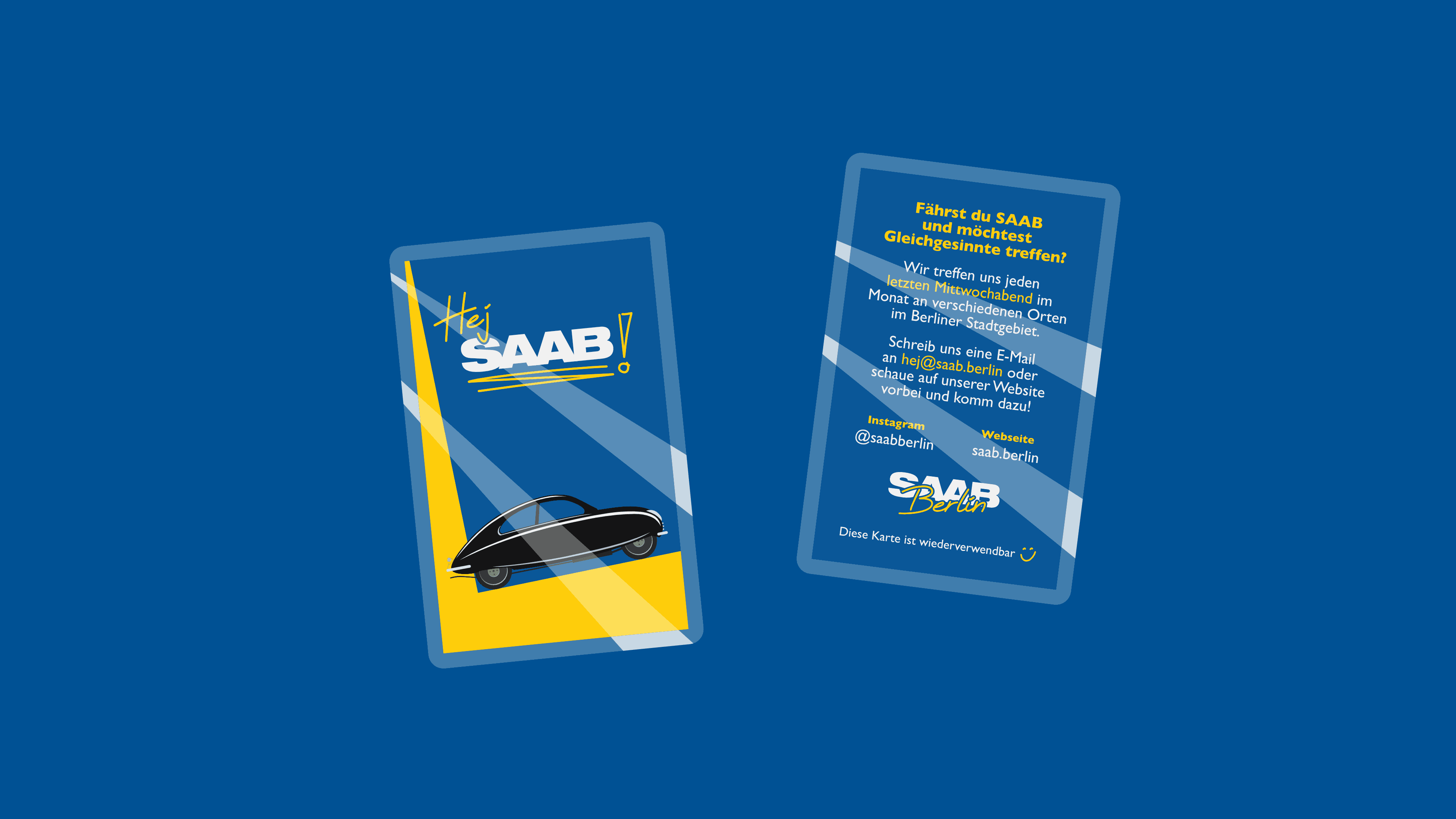 After having learned how to drive a car at 16 - in a Saab 900 - my love for the brand only grew over the past years. So I created a new identity for our local Saab group. In addition to a small website, I also re-designed our business cards that we place on Saabs we see on the road to attract more Saab owners. These are now also laminated to protect from water and dust and to be reusable.